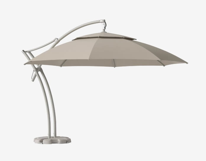 Duży, okrągły parasol o nowoczesnym designie. Posiada solidną boczną nogę, która pozwala bez wysiłku zaaranżować zacieniony obszar, bez konieczności pracy wokół środkowego słupa. Baldachim można ustawić w wielu różnych pozycjach, zapewniając cień przez cały dzień.