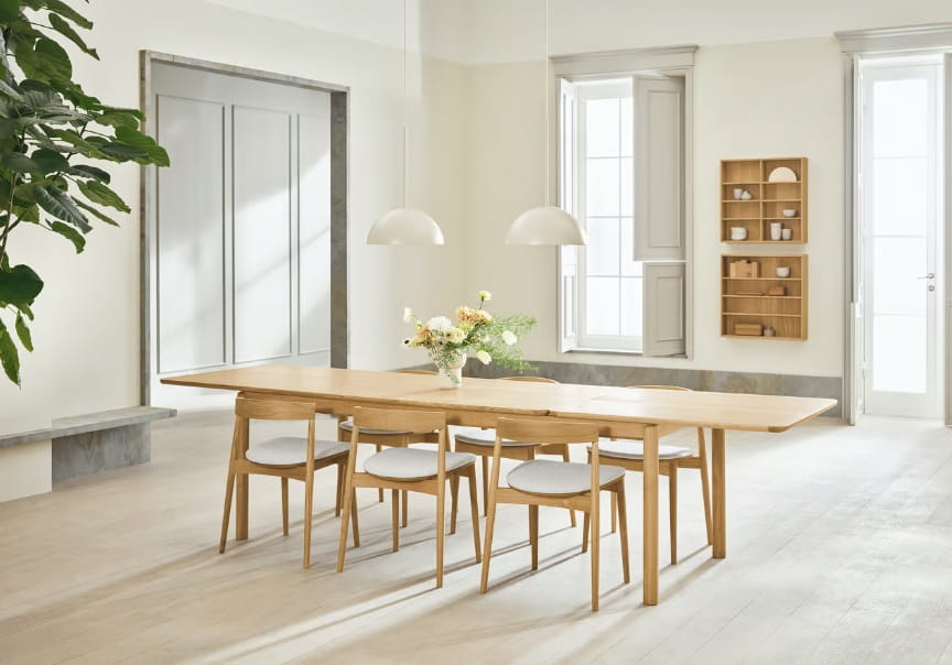 Dzięki dopracowanym detalom i prostym, zaokrąglonym liniom, stół RONYA podnosi doznania kulinarne do najbardziej ciepłej i zachęcającej formy. Studio Nooi stworzyło sprytnie zaprojektowany rozkładany stół, wyposażony w unikalny, wbudowany mechanizm motylkowy, który elegancko rozkłada stół w dwóch prostych ruchach. Dzięki temu blat pozostaje pełną, nieprzerwaną powierzchnią, gdy nie jest rozłożony. Dzięki nogom wykonanym z litego dębu z certyfikatem FSC® i blatowi z pięknego forniru dębowego lub laminatu w różnych kolorach, stół jest dostosowany do wszystkich potrzeb.