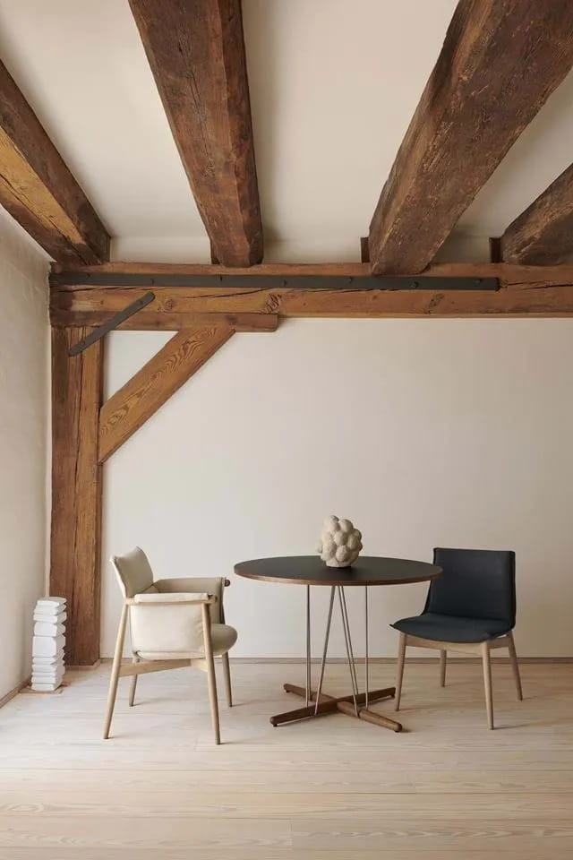 Krzesło E004 EMBRACE to dodatkowy projekt z 2019 roku uzupełniający serię EMBRACE autorstwa austriackiego trio projektowego EOOS. Wizualnie lekkie w swoim wyrazie krzesło nie ma podłokietników i zajmuje niewiele miejsca, pasując do każdego stołu. Projekt pozwala na dużą swobodę ruchu - konstrukcja, która umożliwia użytkownikom swobodną komunikację i interakcję. Tapicerka jest dwukolorowa, a jej swobodny klimat kontrastuje z doskonale wyprofilowaną drewnianą ramą. Jest to świadectwo jedności pomiędzy rzemiosłem i dziedzictwem Carl Hansen & Søn a innowacyjnym podejściem projektowym studia EOOS.