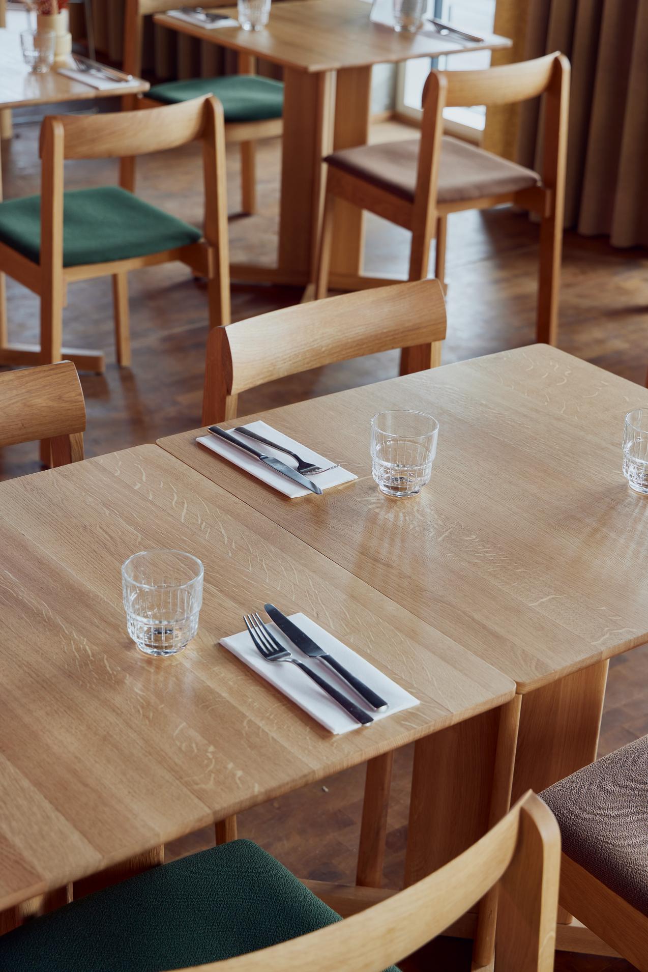 Stabilne, masywne nogi w połączeniu z siedziskiem z forniru nadają konstrukcji zaskakującą lekkość i wizualną ostrość. Wyjątkowe oparcie zostało wygięte parą wodną i wykonane z jednego kawałka litego drewna.