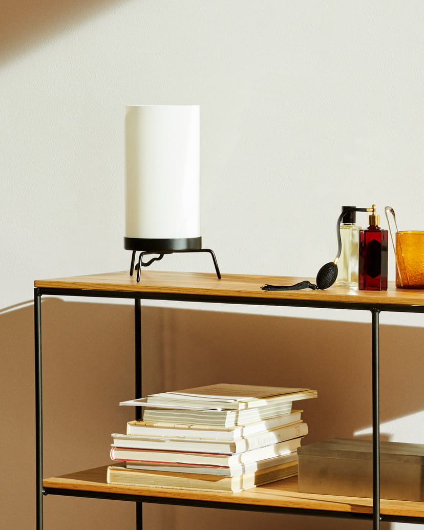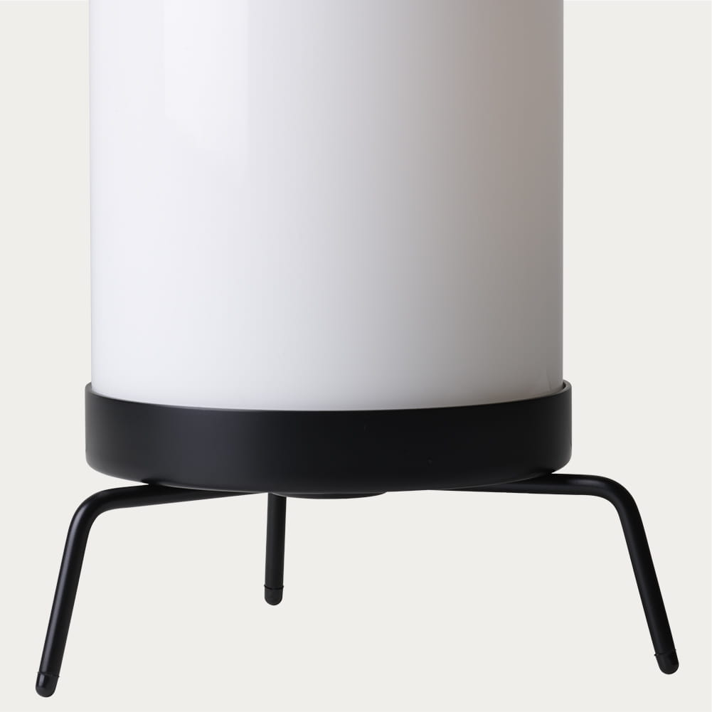 Lampa biurkowa PM-02 emituje rozproszone światło z ręcznie dmuchanego klosza wykonanego z opalowego szkła, tworząc ciepłą, nastrojową poświatę. Trójnożna podstawa z litego nieobrobionego mosiądzu lub czarnej lakierowanej stali stanowi elegancki kontrast dla cylindrycznego klosza.