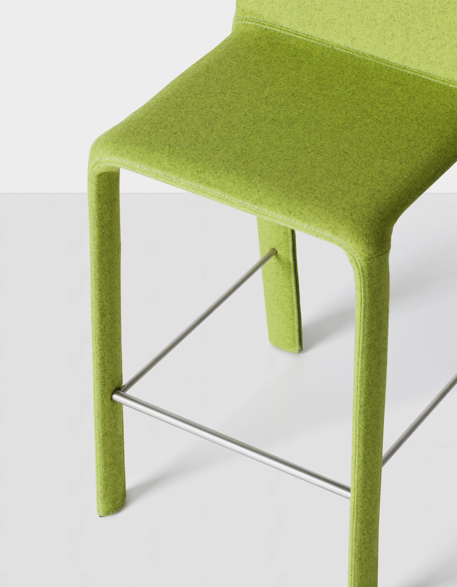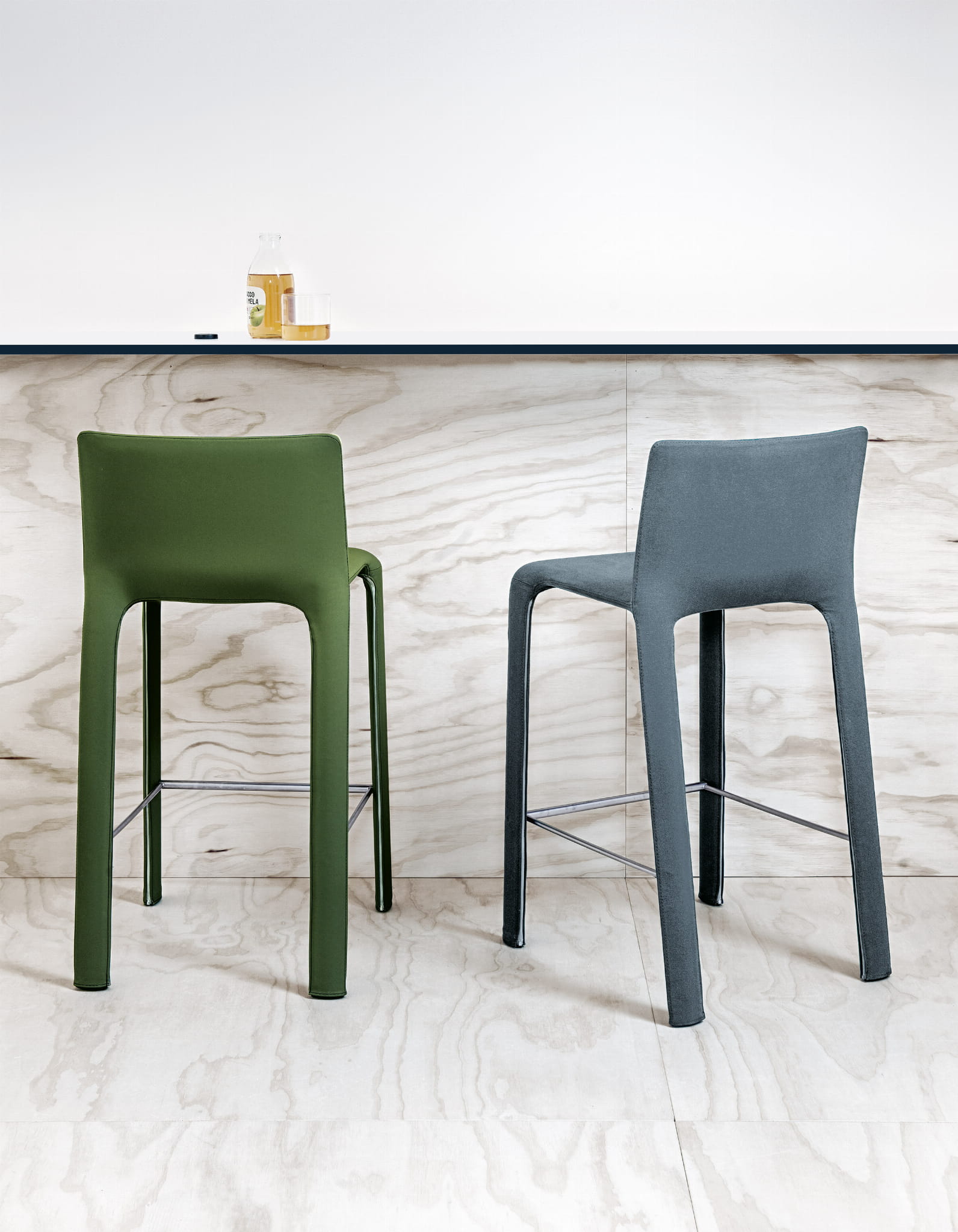 Stołek JOKO jest dostępny w dwóch wysokościach, standardowej 66 cm lub wysokiej 76 cm, oraz w wielu wariantach tkanin obiciowych.