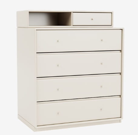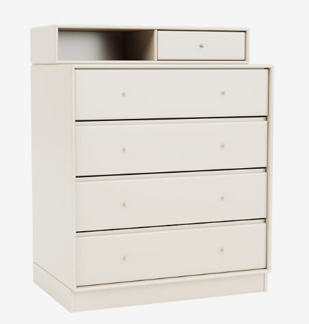 Komoda KEEP marki MONTANA wyśmienicie sprawdzi się w każdej garderobie, sypialni czy przedpokoju lub pokoju dziecięcym. Cztery pojemne szuflady w dolnej partii pomieszczą najpotrzebniejsze, większe przedmioty, takie jak bielizna czy ubrania. Górna część z mniejszą szufladką i półką stanowić będzie idealne miejsce na biżuterię, drobne akcesoria i kosmetyki. Nastawka ta jest zdejmowana, dzięki czemu - wedle aktualnych potrzeb - KEEP zmienić może się w prostą komodę, a ty zyskasz dodatkową półkę, którą powiesić będziesz mógł gdziekolwiek tylko zechcesz. Jak wszystkie produkty MONTANA komoda KEEP dostępna jest w 40 kolorach dzięki czemu z łatwością dopasujesz ją do każdej aranżacji. Aby jak najpełniej odpowiedzieć na twoje potrzeby, możesz wybrać także sposób montażu i wykończenia podstawy - komoda może zostać wyposażona w reling do przymocowania na ścianie, dodatkową bazę (plintę), metalowe nóżki lub kółka. Funkcjonalność, nieskazitelna estetyka i wytrzymałość - to wszystko zagwarantuje ci MONTANA i komoda KEEP.
