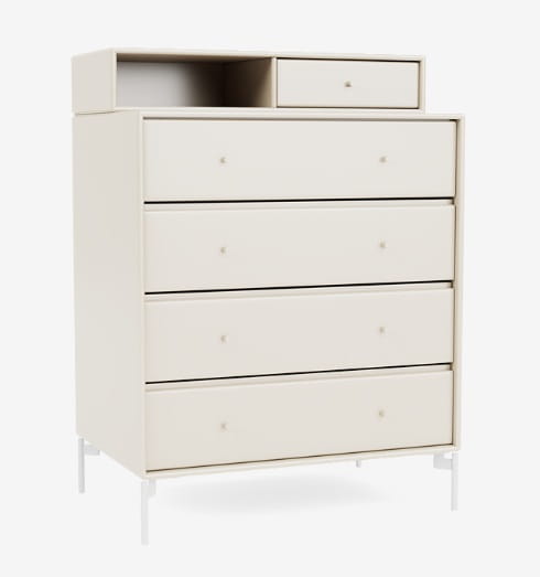 Komoda KEEP marki MONTANA wyśmienicie sprawdzi się w każdej garderobie, sypialni czy przedpokoju lub pokoju dziecięcym. Cztery pojemne szuflady w dolnej partii pomieszczą najpotrzebniejsze, większe przedmioty, takie jak bielizna czy ubrania. Górna część z mniejszą szufladką i półką stanowić będzie idealne miejsce na biżuterię, drobne akcesoria i kosmetyki. Nastawka ta jest zdejmowana, dzięki czemu - wedle aktualnych potrzeb - KEEP zmienić może się w prostą komodę, a ty zyskasz dodatkową półkę, którą powiesić będziesz mógł gdziekolwiek tylko zechcesz. Jak wszystkie produkty MONTANA komoda KEEP dostępna jest w 40 kolorach dzięki czemu z łatwością dopasujesz ją do każdej aranżacji. Aby jak najpełniej odpowiedzieć na twoje potrzeby, możesz wybrać także sposób montażu i wykończenia podstawy - komoda może zostać wyposażona w reling do przymocowania na ścianie, dodatkową bazę (plintę), metalowe nóżki lub kółka. Funkcjonalność, nieskazitelna estetyka i wytrzymałość - to wszystko zagwarantuje ci MONTANA i komoda KEEP.