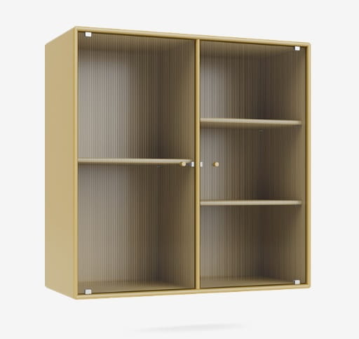 RIPPLE II to witryna z 2 drzwiami z falistego szkła. Szafka jest dostępna z szynami do zawieszania, cokołem i nogami. Może być używana jako górna szafka do kuchni lub jako półka ekspozycyjna w salonie lub jadalni.