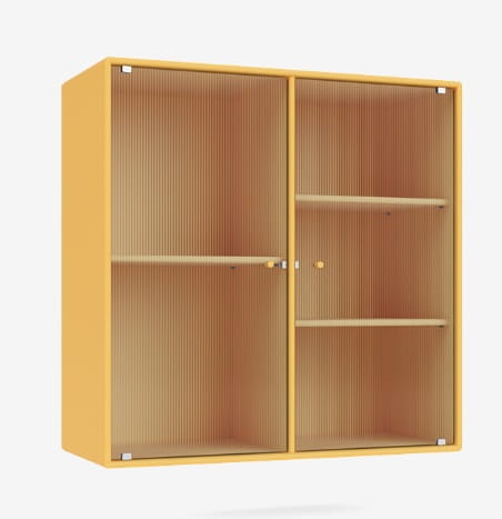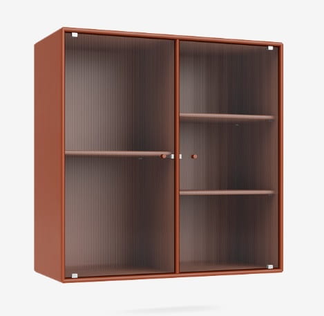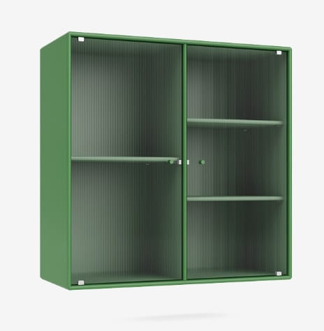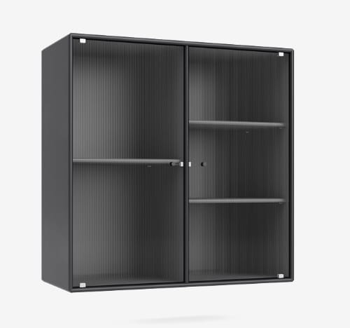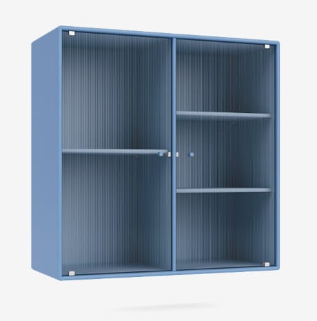 RIPPLE II to witryna z 2 drzwiami z falistego szkła. Szafka jest dostępna z szynami do zawieszania, cokołem i nogami. Może być używana jako górna szafka do kuchni lub jako półka ekspozycyjna w salonie lub jadalni.