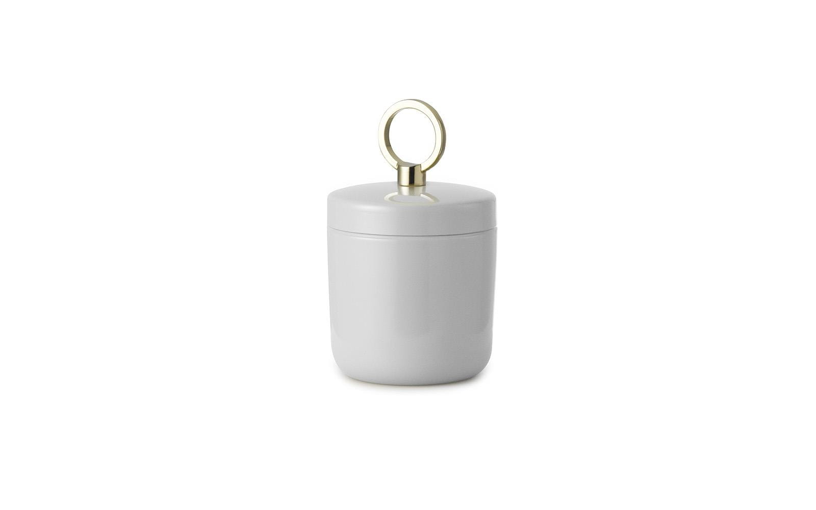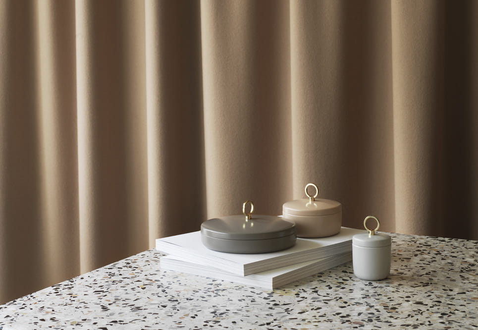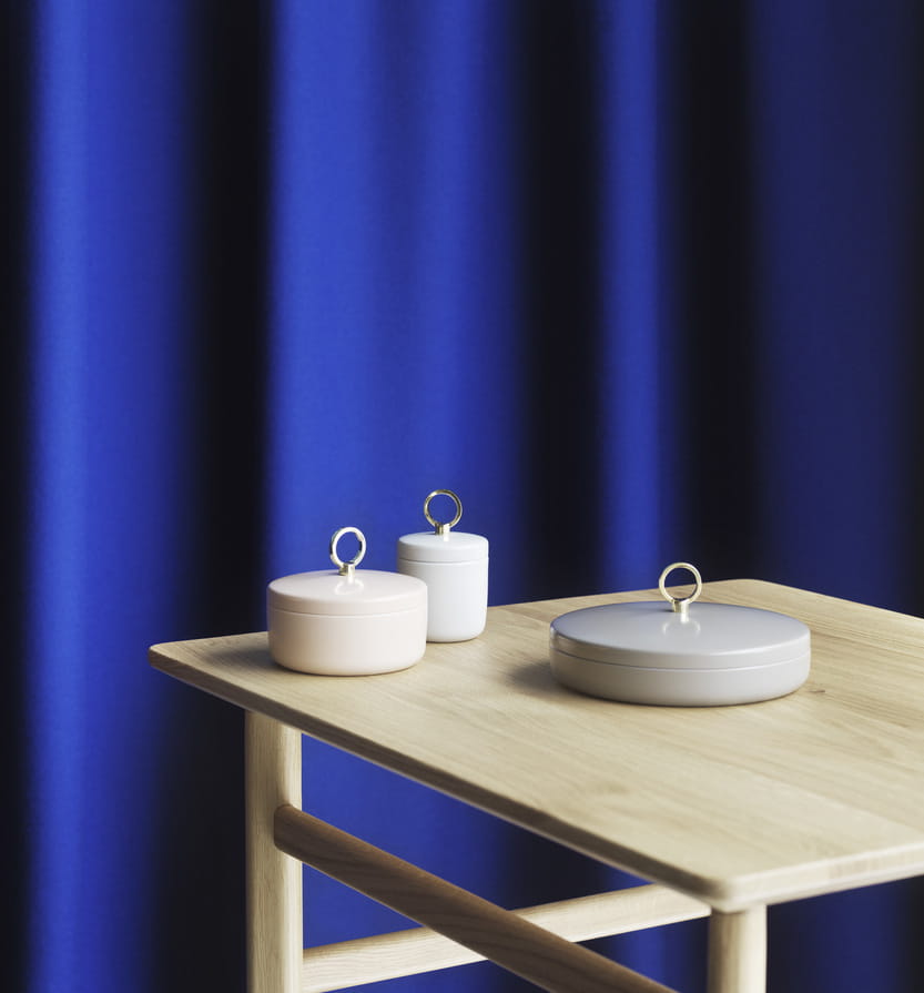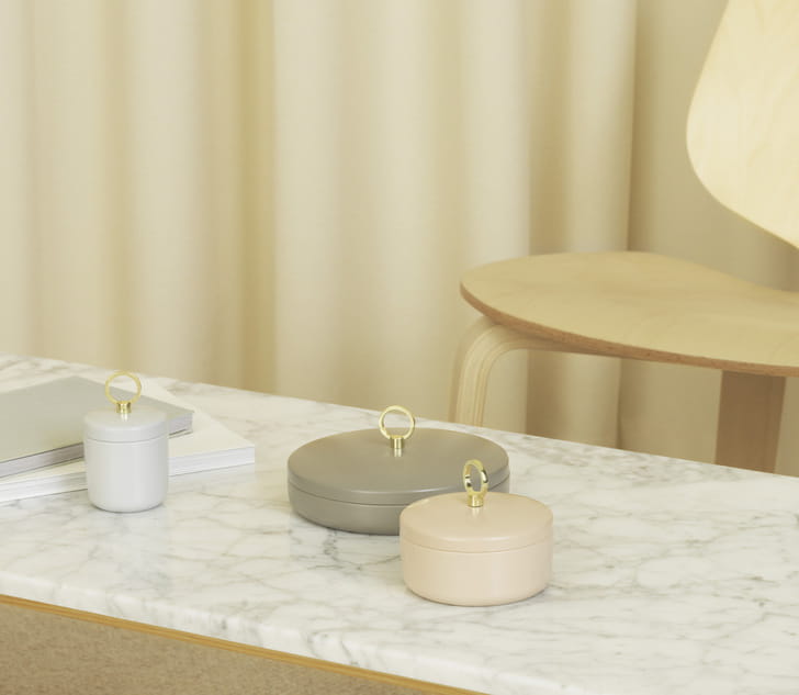 Ring to seria małych, eleganckich pudełek do przechowywania drobnych rzeczy osobistych, takich jak biżuteria, kosmetyki i artykuły papiernicze. Pudełko Ring wykonane jest z błyszczącej, malowanej proszkowo stali, dostępnej w trzech różnych rozmiarach w ziemistych odcieniach piasku, szarości i taupe. Złoty pierścień na pokrywie pełni funkcję funkcjonalną, będąc jednocześnie dekoracyjnym detalem.
