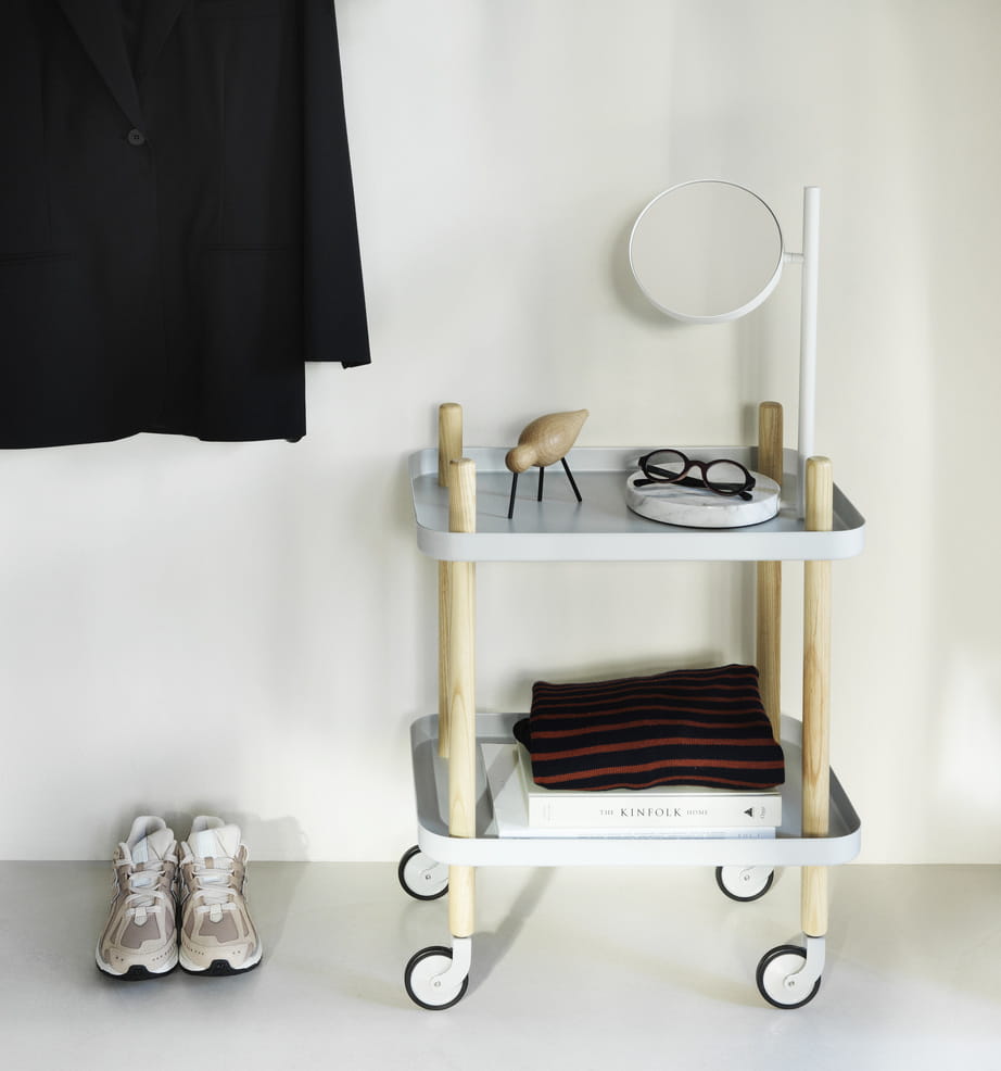 Stolik / barek na kółkach BLOCK od marki NORMANN COPENHAGEN to wyjątkowo estetyczny i praktyczny dodatek, wyposażony w wygodne kółka, które doskonale sprawdzą się zarówno w kuchni, salonie, czy też sypialni ułatwiając przemieszczenie postawionych na nim elementów, takich jak delikatna zastawa stołowa lub świeżo przygotowane śniadanie. Wzbogacenie klasycznego modelu stolika/barku na kółkach o dodatkowy blat, który tworzy dwupoziomową konstrukcję, sprawia, że BLOCK jest nie tylko łatwy w przemieszczaniu, ale i wyjątkowo funkcjonalny, dzięki zwiększonej przestrzeni, na której możemy położyć najpotrzebniejsze rzeczy. Staranne wykonanie ze stali oraz jesionu sprawia, że dodatek firmy NORMANN COPENHAGEN to doskonała inwestycja, która nie tylko wzbogaci twoje wnętrze odrobiną nowoczesności, ale i przetrwa w nienagannym stanie przez długie lata.