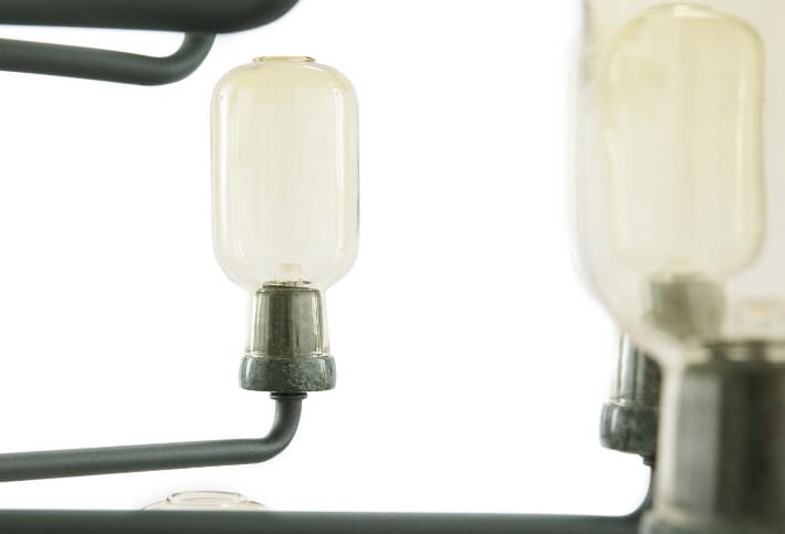 AMP to intrygująca kolekcja lamp inspirowanych wzornictwem przemysłowym lat 60. Ze względu na kształt lampy AMP nawiązują do stylistyki industrialnej, natomiast zastosowanie szlachetnego marmuru i przydymionego szkła czyni je znacznie bardziej eleganckimi. Żarówka z żarnikiem z włókna węglowego w połączeniu z barwionym szklanym kloszem daje delikatne, nastrojowe światło. Budowany wokół stalowej bazy żyrandol AMP, z którego wyprowadzone zostały ramiona z żarówkami - miniaturami lampy stołowej AMP to niezwykle eleganckie oświetlenie, które pięknie ozdobi każde wnętrze. Dostępny w 2 rozmiarach i 3 wariantach kolorystycznych. Z pewnością przyciągnie wzrok każdego miłośnika designu. Produkt marki Normann Copenhagen idealnie sprawdzi się w różnorodnych wnętrzach, które wzbogaci o niebanalny dodatek i eleganckie źródło światła.
