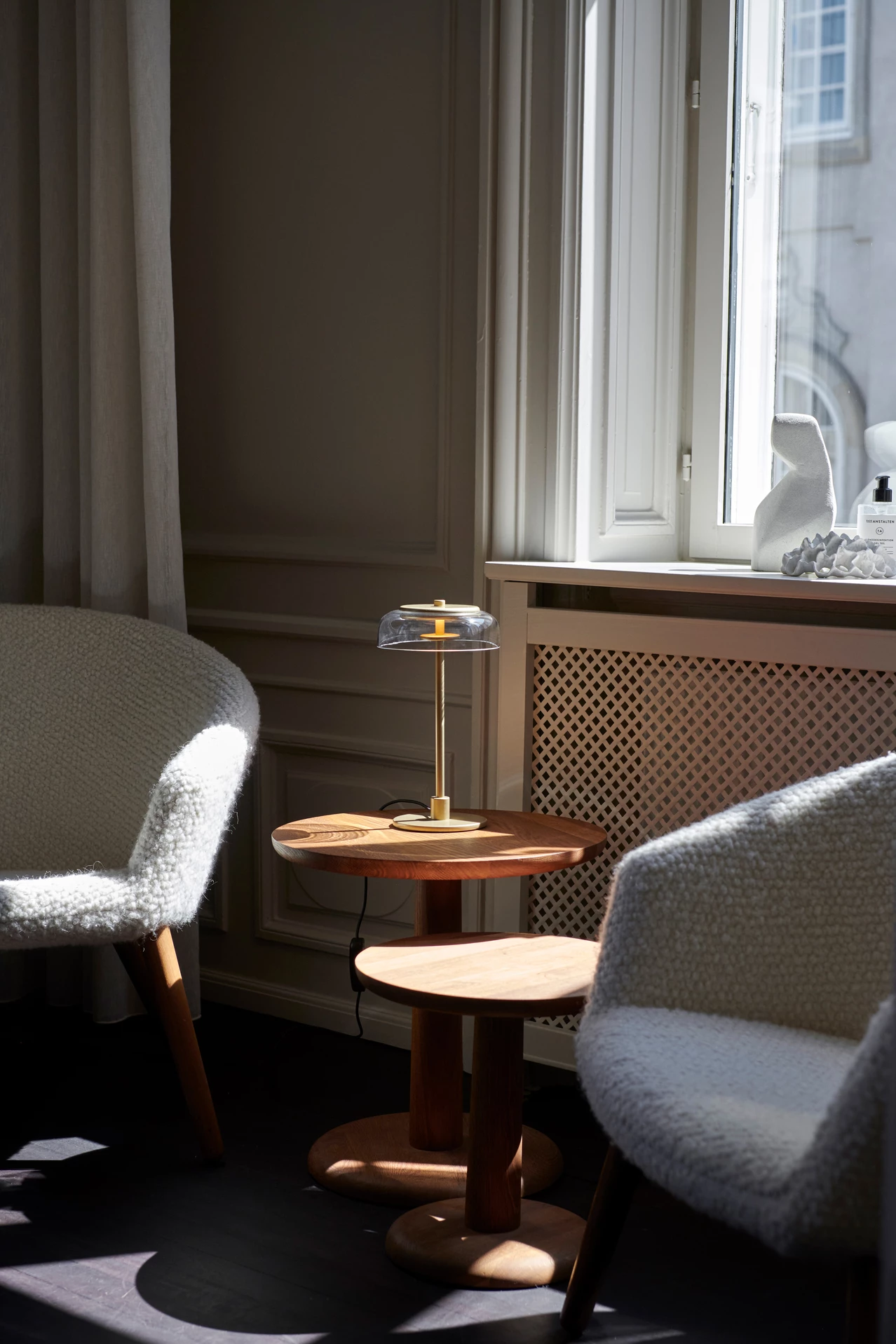 Blossi Table small to mniejsza wersja lampy Blossi table. Jest to lampa stołowa o smukłej i prostej formie. Zintegrowana dioda LED delikatnie odbija światło w kloszu, przypominając złote jesienne światło. Kolekcja Blossi jest teraz produkowana w wersji niskonapięciowej z łatwo wymienną kartą LED, oferując światło bez migotania i spełniając najnowsze unijne przepisy dotyczące efektywności energetycznej oświetlenia. Kabel ze ściemniaczem i wtyczką EU + UK.