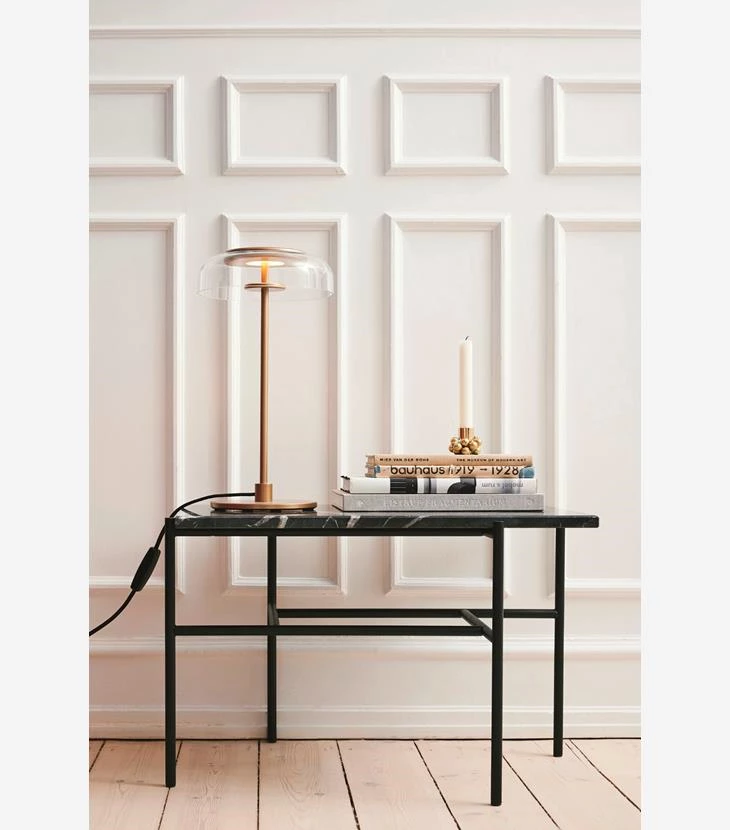 Blossi Table to lampa stołowa o smukłej i prostej formie. Złoty metal dodaje pomieszczeniu ciepła i ekspresji, a zintegrowana dioda LED delikatnie odbija światło w kloszu, przypominając złote jesienne światło. Kolekcja Blossi jest teraz produkowana w wersji niskonapięciowej z łatwo wymienną kartą LED, oferując światło bez migotania i spełniając najnowsze unijne przepisy dotyczące efektywności energetycznej oświetlenia. Kabel ze ściemniaczem i wtyczką EU + UK.