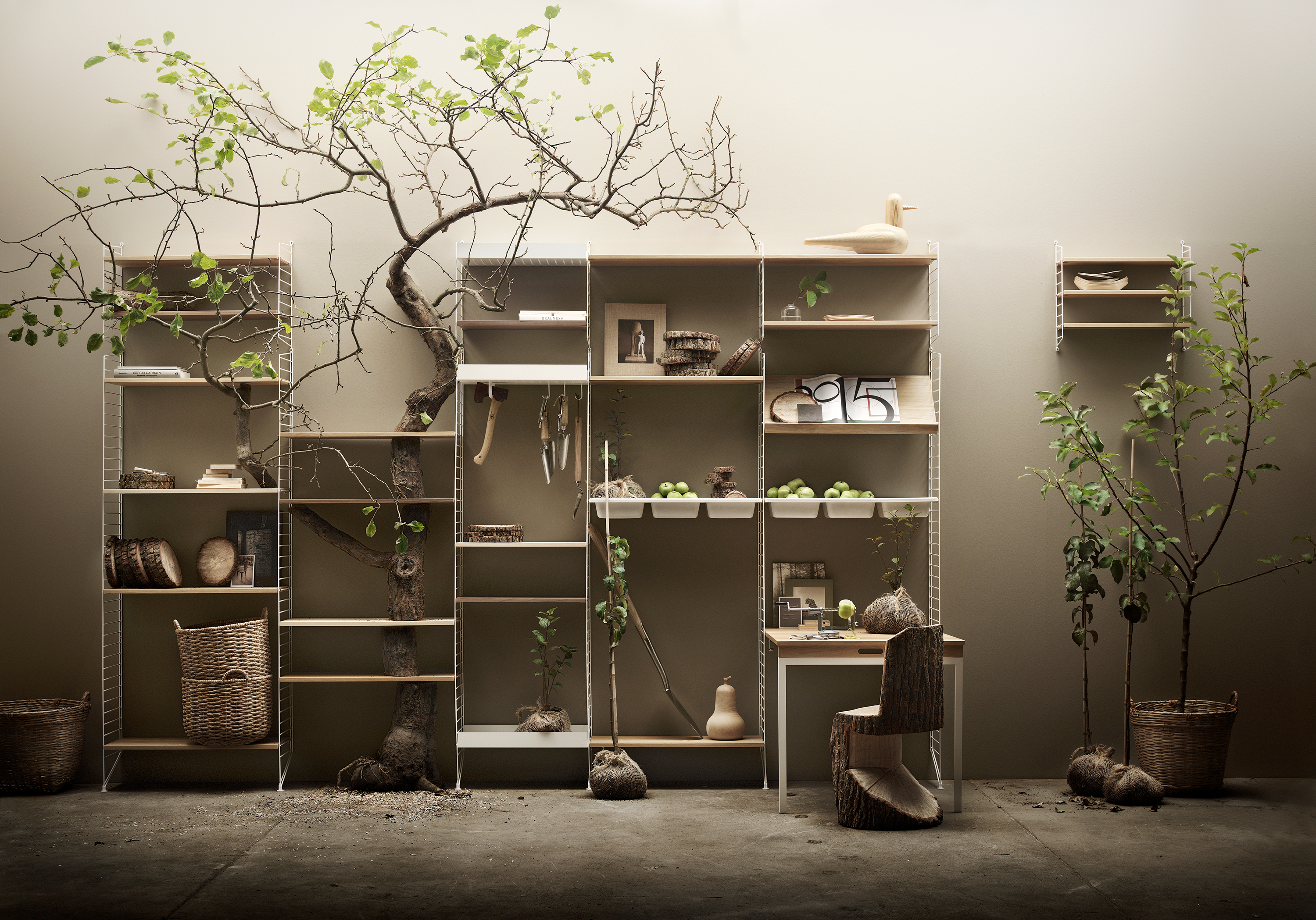 System string® niezwykle łatwo zaprojektować i zamontować, a także poddawać modyfikacjom wedle aktualnych potrzeb. Występujące w różnych szerokościach i długościach półki, blaty oraz szafki zawieszone na bocznych, drabinkowych panelach łatwo przemieścić, zmieniając charakter i sposób użytkowania całości. Regał zbudowany w oparciu o system string® jest niezwykle stabilny, a możliwość jego rozbudowywania ograniczona jedynie przez zastaną przestrzeń i wyobraźnię. Szeroka gama kolorystyczna i materiałowa paneli, półek, blatów, szafek oraz akcesoriów pozwala stworzyć zarówno zróżnicowane barwnie, jak i monochromatyczne zestawy, przystosowane do każdego typu pomieszczeń.