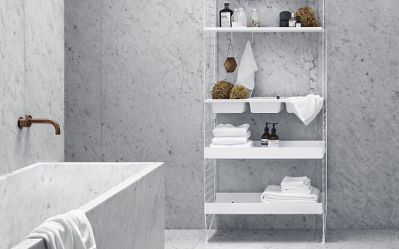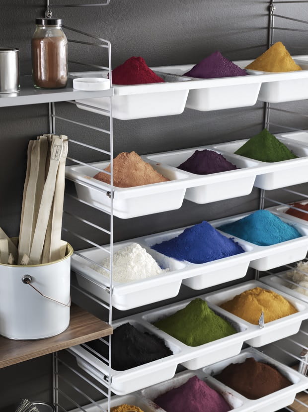 System string® niezwykle łatwo zaprojektować i zamontować, a także poddawać modyfikacjom wedle aktualnych potrzeb. Występujące w różnych szerokościach i długościach półki, blaty oraz szafki zawieszone na bocznych, drabinkowych panelach łatwo przemieścić, zmieniając charakter i sposób użytkowania całości. Regał zbudowany w oparciu o system string® jest niezwykle stabilny, a możliwość jego rozbudowywania ograniczona jedynie przez zastaną przestrzeń i wyobraźnię. Szeroka gama kolorystyczna i materiałowa paneli, półek, blatów, szafek oraz akcesoriów pozwala stworzyć zarówno zróżnicowane barwnie, jak i monochromatyczne zestawy, przystosowane do każdego typu pomieszczeń.