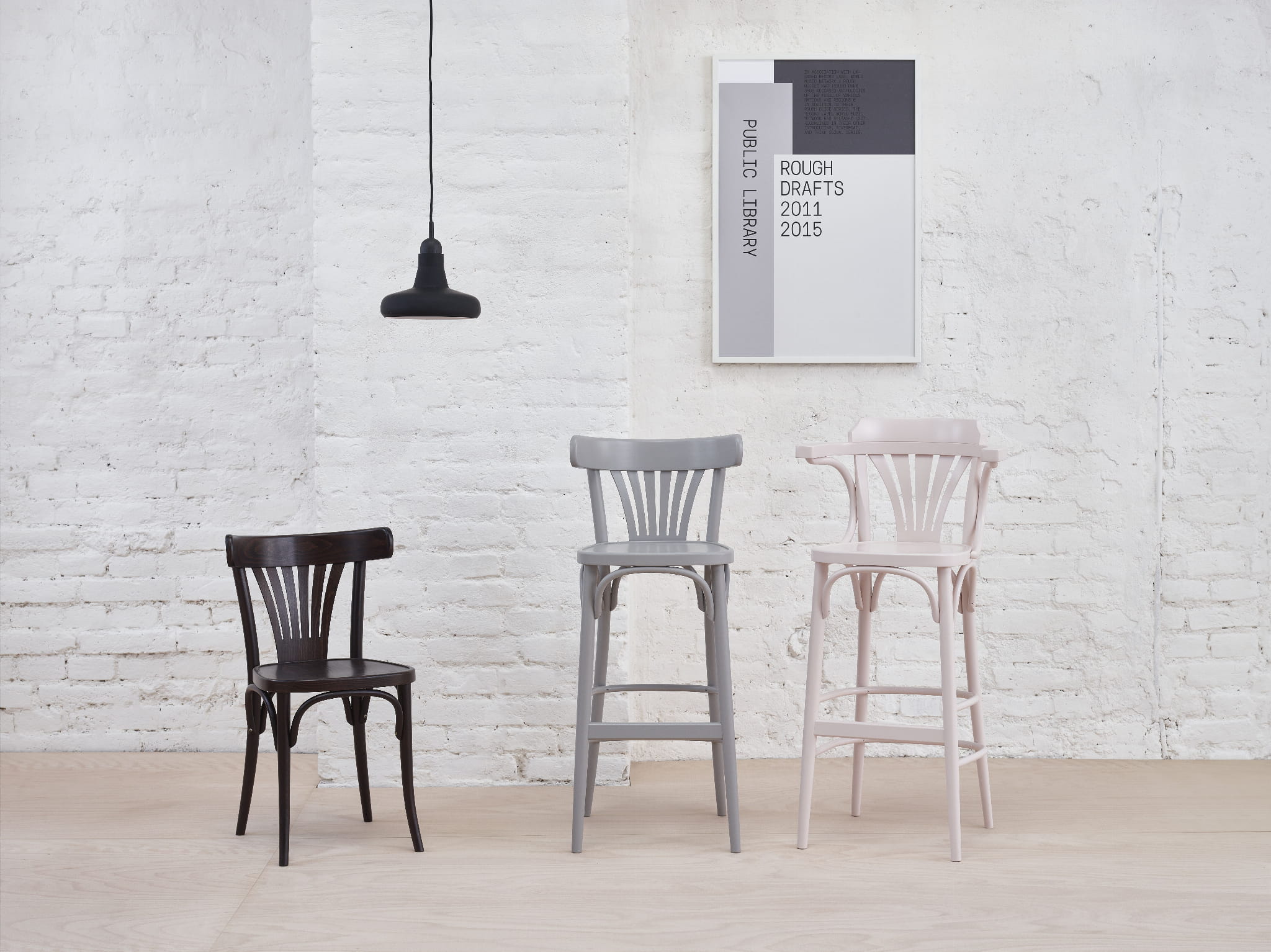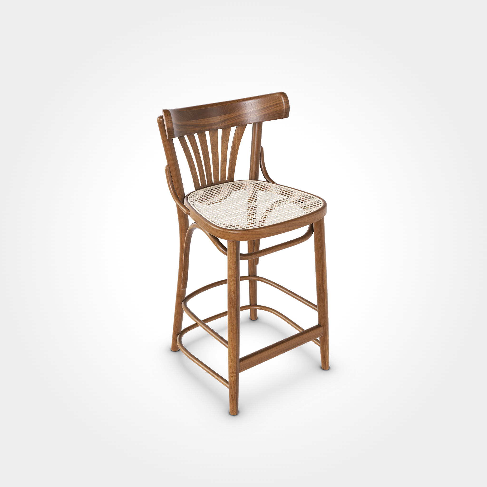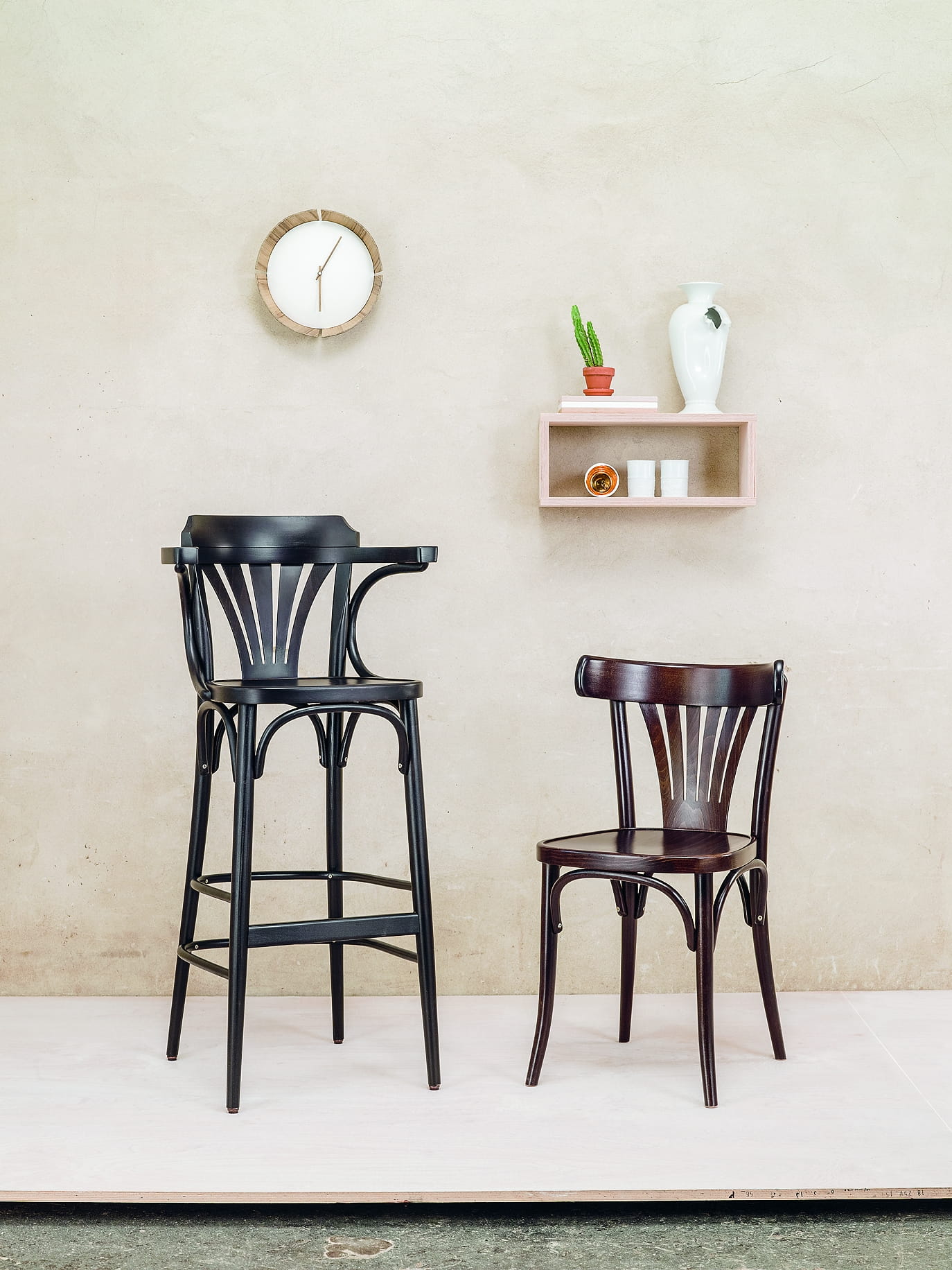 Projekt krzesła 56 zadebiutował już w 1885 roku. Oparcie modelu 56 wypełnia charakterystyczny wachlarz wykonany ze sklejki. Klasyczne, gięte krzesło TON, które oferuje świetne podparcie dla pleców. Możliwość wykonania grawerowania po zewnętrznej części oparcia. Tutaj w wersji tapicerowanego krzesła barowego dostępnego w dwóch różnych wysokościach.